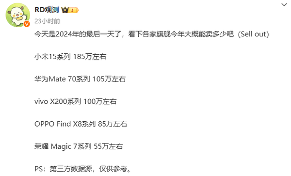 【CNMO科技音信】近日,CNMO注目到,罕有码博主汇总了2024年华为、小米、OPPO、vivo、荣耀这五大国产手机厂商最新款年度旗舰的销量数据。